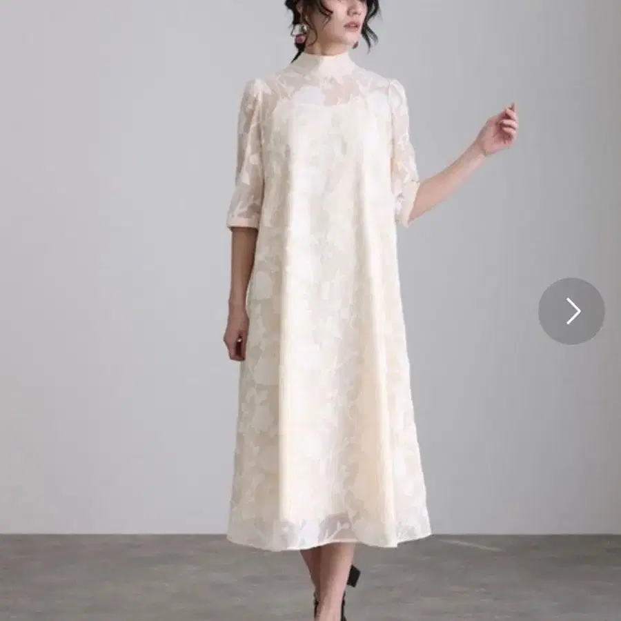 크림색 꽃무늬 7부 소매 원피스