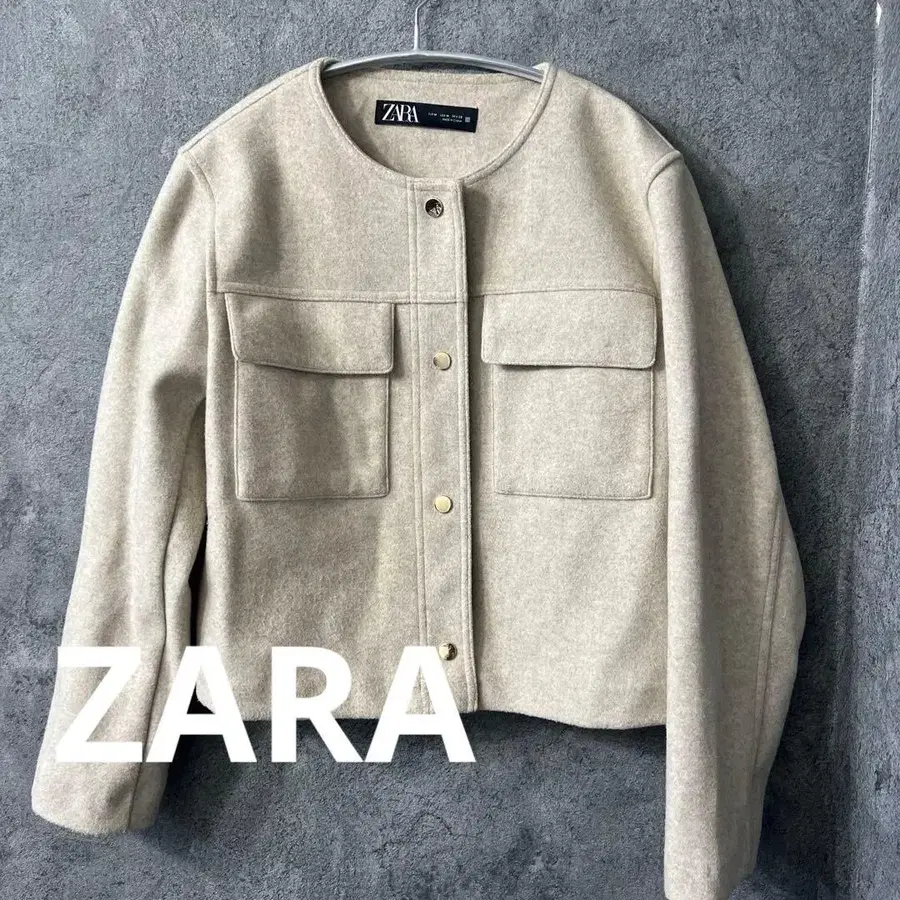 심플하고 깔끔한 실루엣의 베이지 노카라 자켓, 프론트 포켓 부착. - 브랜드: ZARA - 기장: 50cm - 색상: 베이지 - 스타일: 노카라 자켓 - 포켓: 프론트 포켓 2개 - 디자인: 심플하고 깔끔한 실루엣