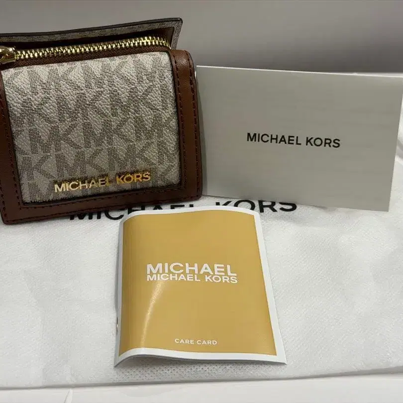 자동 번역되었어요. 원문보기브라운 색상의 3단 폴더형 지갑, MICHAEL KORS 로고 포함.