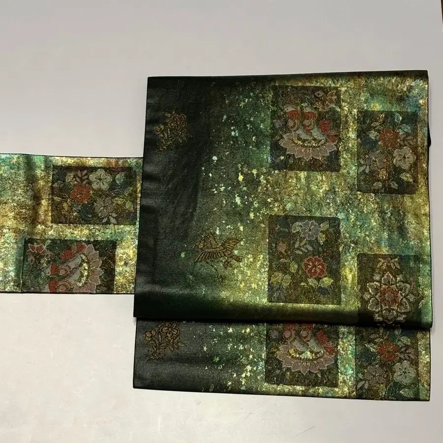 자동 번역되었어요. 원문보기짙은 녹색 바탕에 새와 꽃무늬 금박의 빛깔이 아름다운 디자인의 나고야 오비입니다. 탄탄한 촉감으로 짜임새의 우수함도 느낄 수 있는 일품입니다.