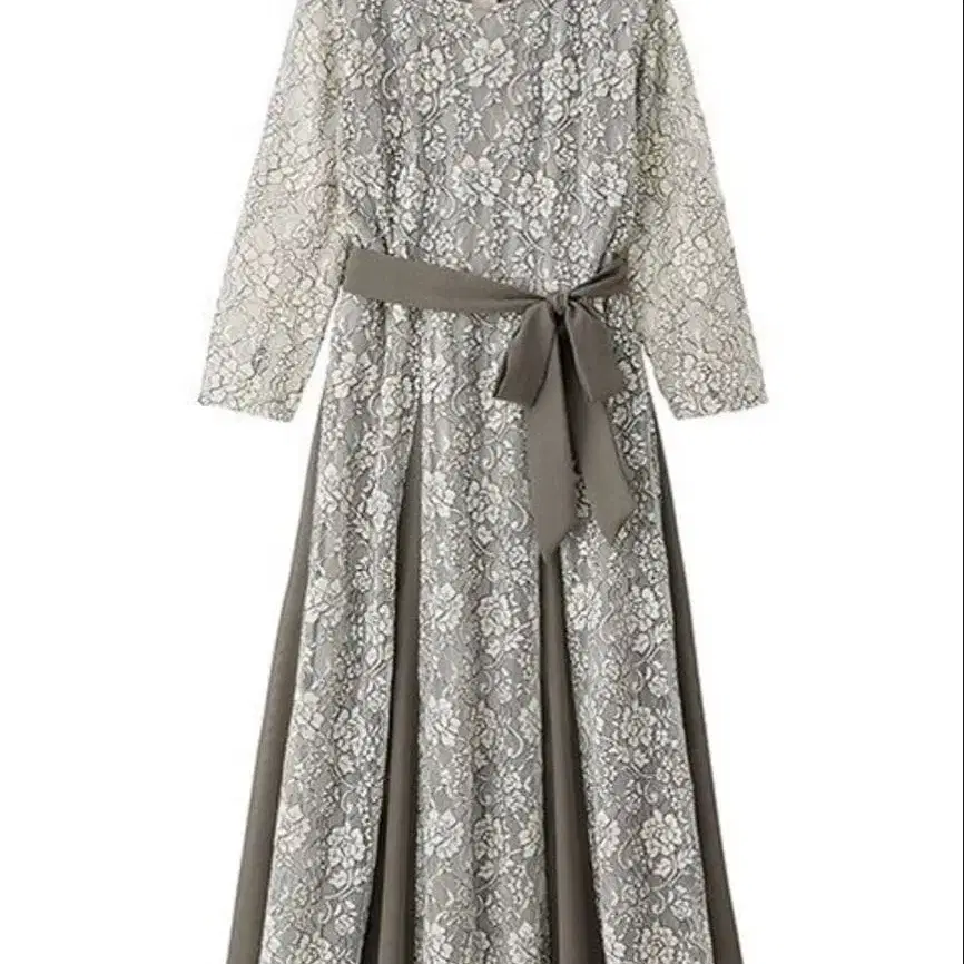 그레이 배색 레이스 절개 원피스, 허리 리본 포함으로 엘레강트한 스타일.
