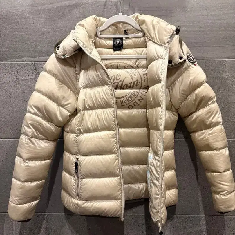 자동 번역되었어요. 원문보기아이보리 후드 부착 다운 자켓, 44 사이즈 Cape Horn 로고가 있어 스타일리시합니다.
