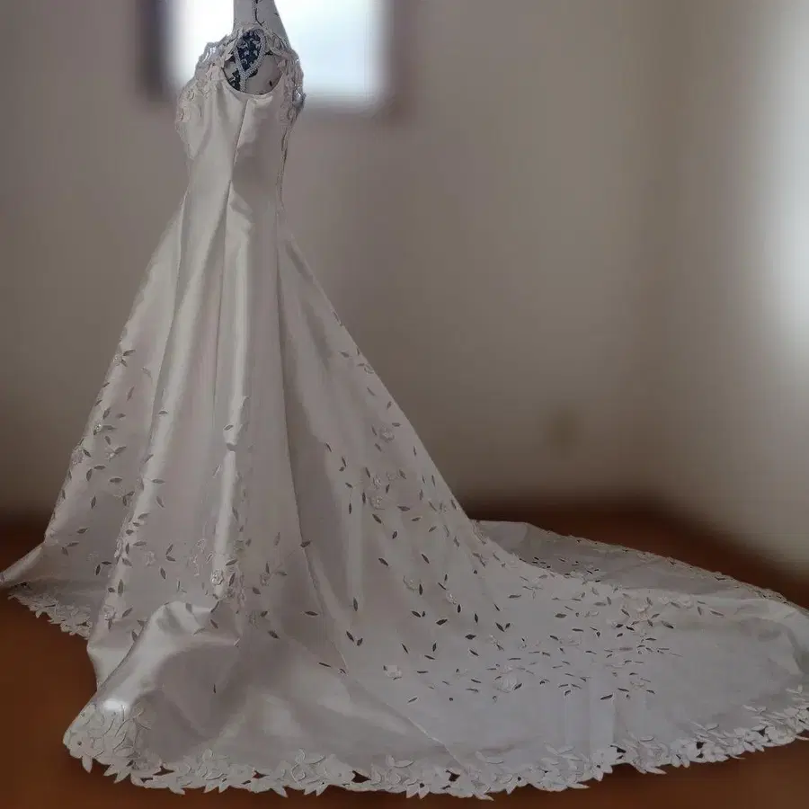 꽃무늬 자수가 놓인 화이트 웨딩 드레스, 긴 트레인이 특징.