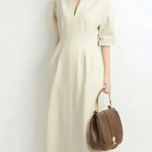 계절감 - 봄, 여름, 가을, 겨울 크림색 V넥 롱 드레스, 벌룬 슬리브 디자인.