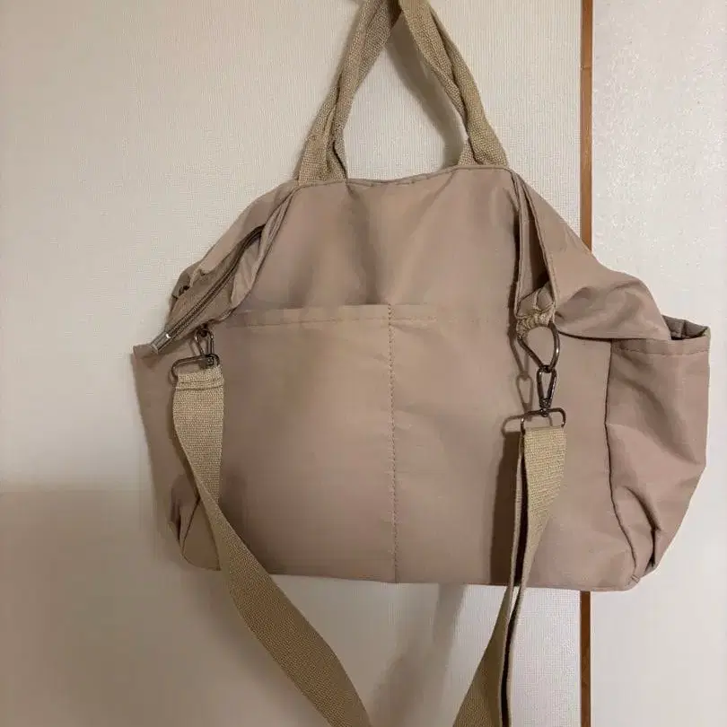 자동 번역되었어요. 원문보기베이지 나일론 소재 숄더백, 외부 포켓 부착으로 실용적입니다.