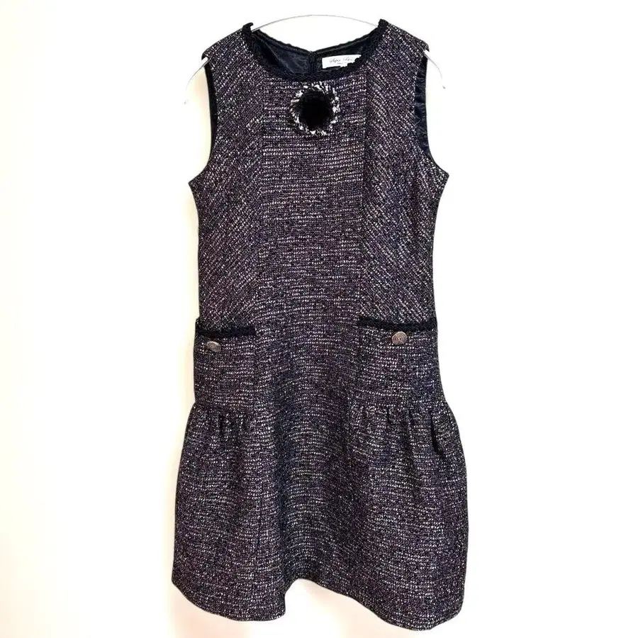 네이비 계열의 트위드풍 슬리브리스 원피스.