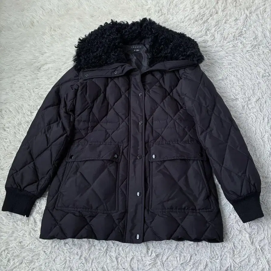 옷깃에 퍼가 달린 퀼팅 다운 자켓입니다.