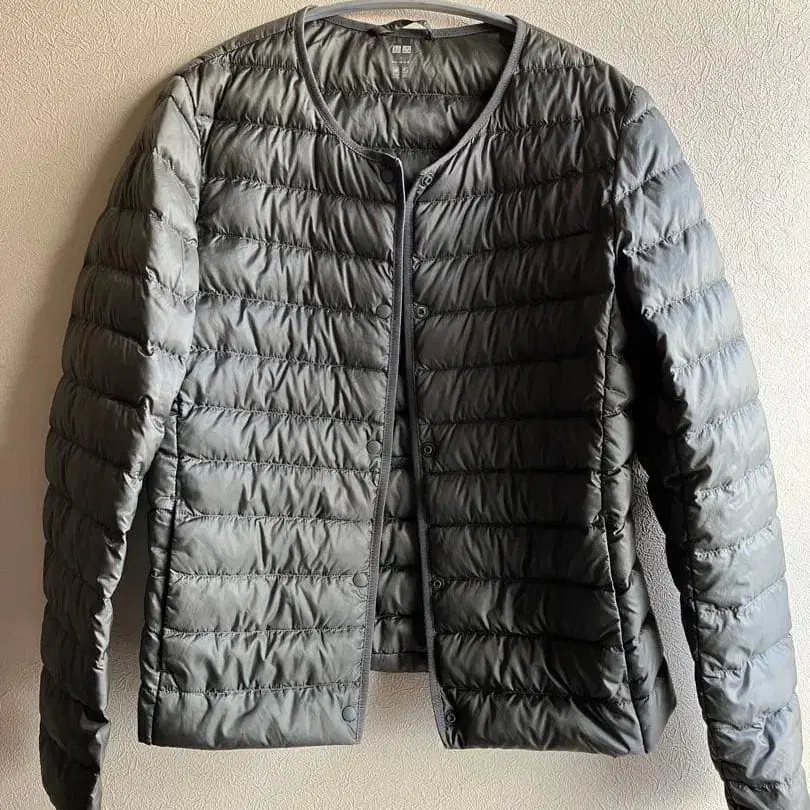가볍고 따뜻한 그레이 색상의 다운 자켓, UNIQLO S 사이즈.