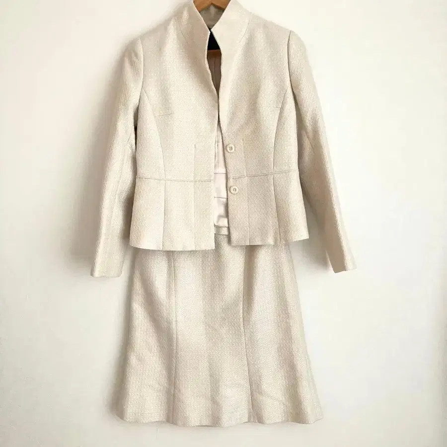 아이보리 색상의 노카라 자켓과 무릎 기장 스커트 정장 세트입니다. 텍스처가 있는 원단이 특징입니다.