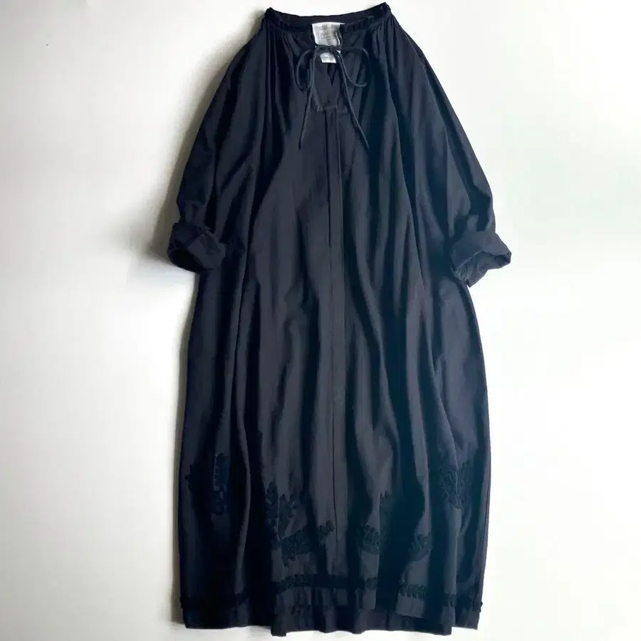 목 부분과 밑단의 입체적인 자수가 유일무이한 핸드워크 느낌을 주는 비어즐리다운 코다와리 아이템입니다.