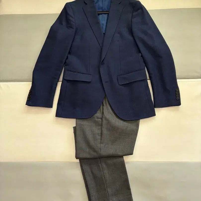 네이비 색상의 자켓과 그레이 색상의 팬츠 상하의 세트입니다. 울 혼방 소재로 스타일리시한 인상을 줍니다.