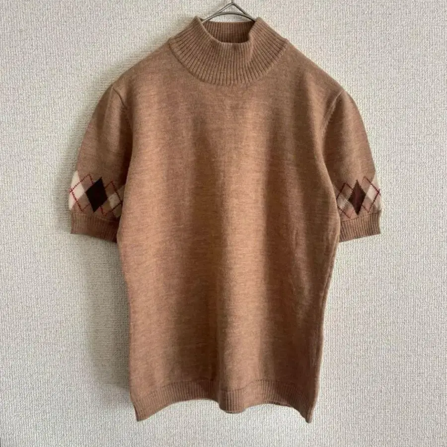 키이스 아가일 무늬 하이넥 반팔 니트 스웨터 M 얇은 소재 울 고급