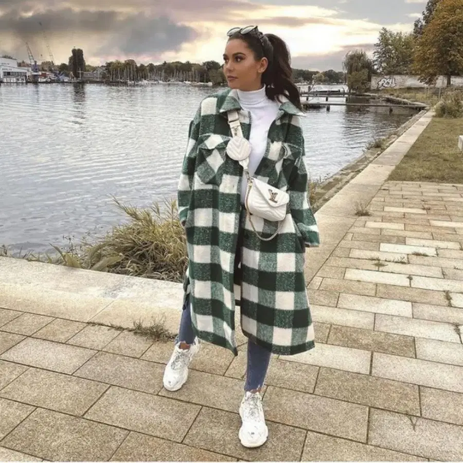 그린과 화이트 체크 무늬 오버 사이즈 자켓