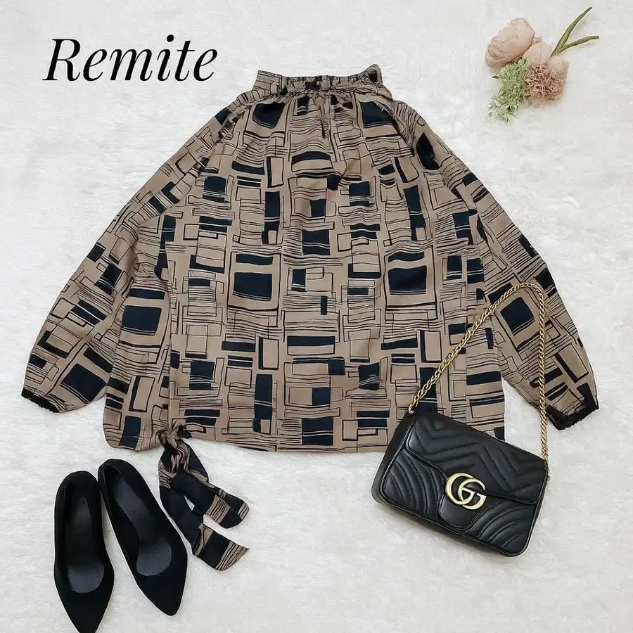 차분한 베이지 x 블랙 배색이 성숙한 느낌을 주는 Remite의 올 패턴 블라우스입니다.