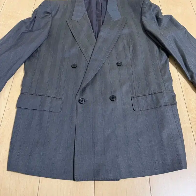 다크 그레이 색상의 더블 브레스트 테일러드 자켓, 비즈니스 장면에 최적.