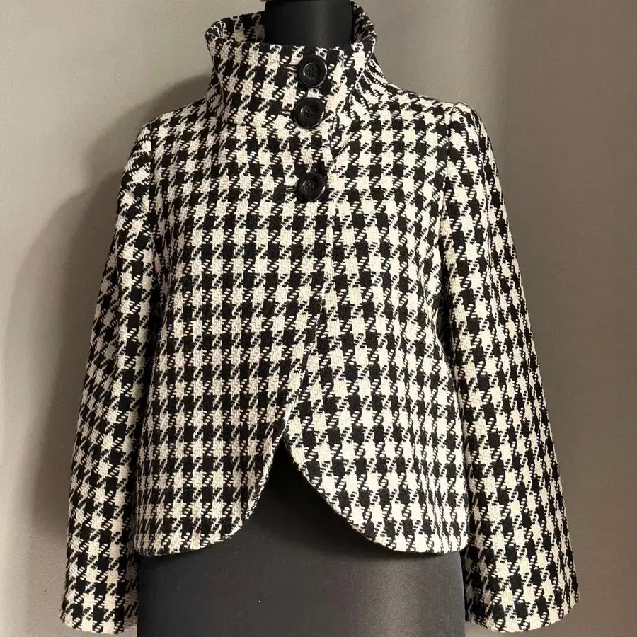 자동 번역되었어요. 원문보기하운드투스 패턴의 버튼 부착 자켓, 숏 기장으로 볼레로 스타일 연출