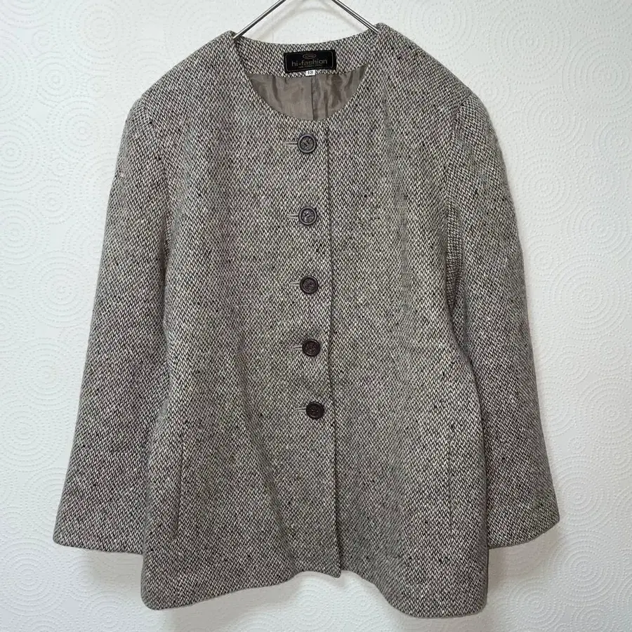 트위드 소재의 브라운 계열 노카라 자켓, 심플하고 세련된 디자인.