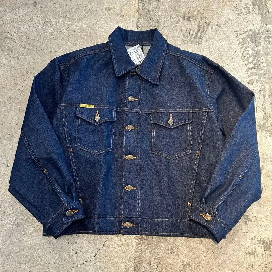 프리즌 블루스에서, 죄수들이 핸드메이드로 만든 트래커 자켓. 외부 패치로 덧댄 가슴 플랩 포켓에 더해, 가슴부터 아래의 프론트 패널을 이중으로 하고, 사선으로 재단된 겉감의 끝부분이 핸드 포켓의 입구가 되는 독자적인 패널링이 눈길을 끕니다.