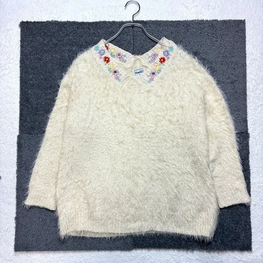 자수가 들어간 긴팔 스웨터/포근한 샤기 니트 소재로 따뜻하고 부드러운 촉감/옷깃의 컬러풀한 플라워 자수가 포인트/캐주얼 코디의 주인공으로 제격/페미닌한 인상으로 데이트나 외출에도 ◎ /아크릴 100