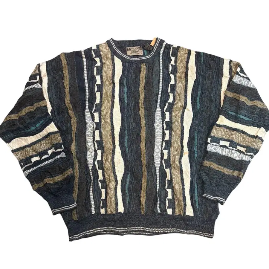 다색 스트라이프 패턴이 특징인 니트 스웨터. - 색상: 다색 ( 파랑, 브라운, 화이트, 블랙 ) - 디자인: 스트라이프 패턴 - 소재: 니트 - 소매: 긴팔 - 넥라인: 크루넥 방문해 주셔서 감사합니다. 상품명 VINTAGE 90S 쿠지 타입 3D 코튼 스웨터 사이즈 XL 가슴 너비 66cm 기장 75cm 소매 길이 85cm 색상 이미지 참조 상태 이미지와 같이 약간의 얼룩이 있지만, 얼룩 제거하면 지워지는 수준이며 패턴상 크게 눈에 띄지 않습니다. 착용에 문제가 될 만한 데미지는 없습니다. 기타 좀처럼 찾기 힘든 인기 빈티지, 쿠지 타입 3D 스웨터. 인기 디자인. 코튼 소재라 세탁기 사용이 가능하며 맨살에 직접 입어도 전혀 까끌거리지 않습니다.