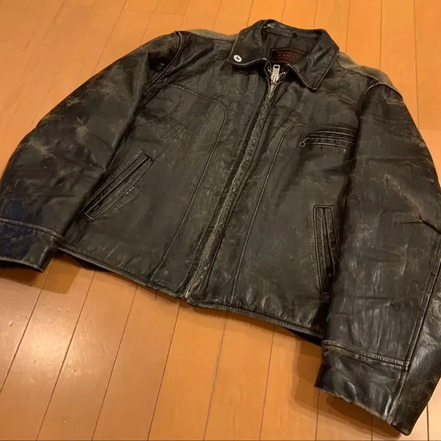 가죽에는 오랜 착용으로 인한 깊은 주름감, 페이드, 구김이 보이며, 균일하지 않은 얼룩감이 리얼 빈티지의 표정을 만들어내고 있습니다.