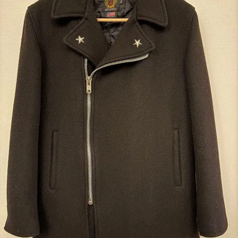 USA 제조 울 바디에 사선 지퍼와 별 모양 스터드를 배치한,