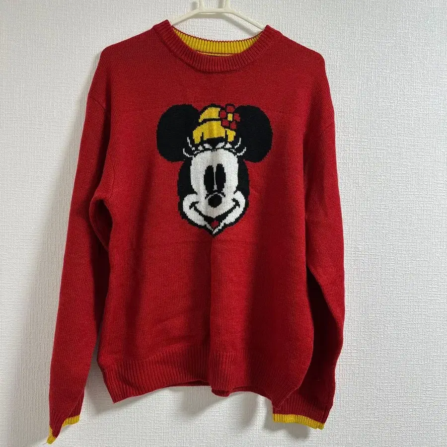 미니 마우스 디자인이 특징인 빨간색 니트 스웨터.