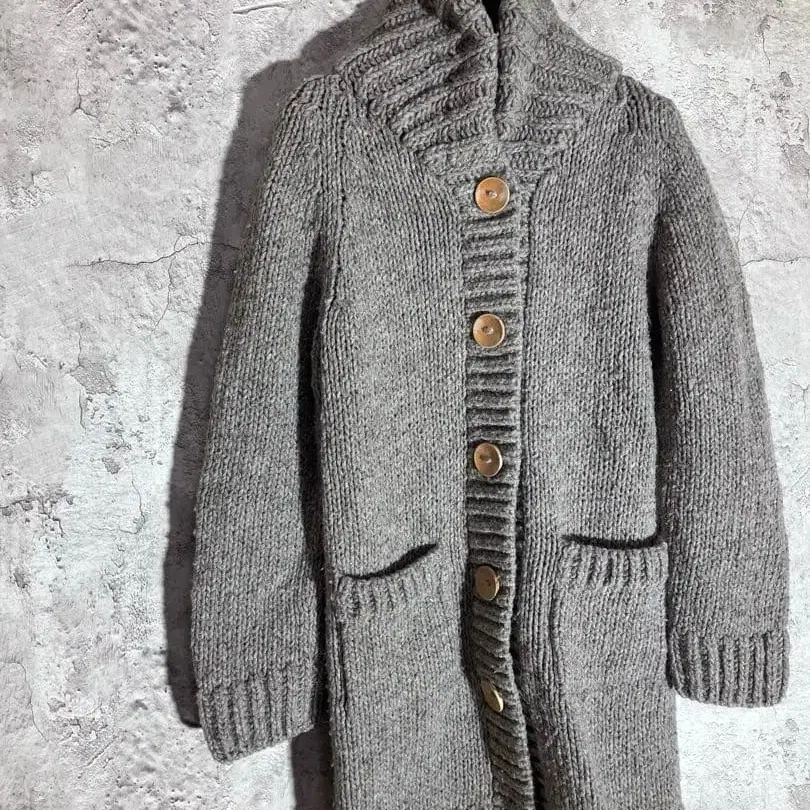 자동 번역되었어요. 원문보기후드 부착 그레이 니트 가디건, 단추식으로 앞면에 포켓 부착.