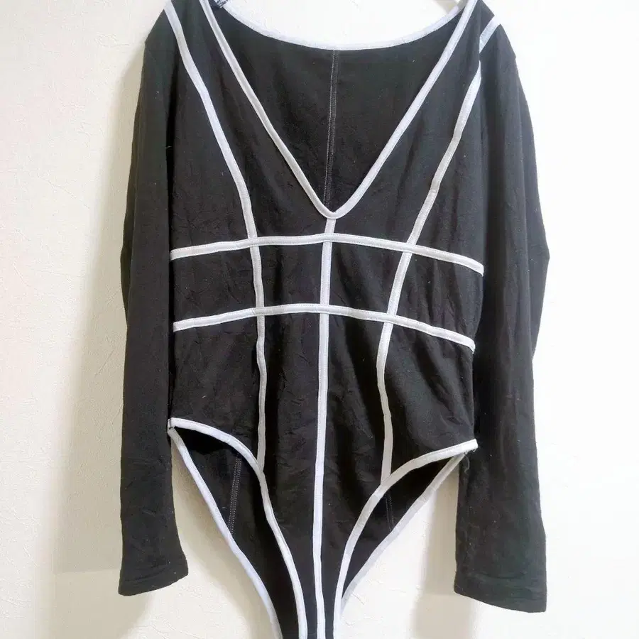 자동 번역되었어요. 원문보기블랙 긴팔 바디수트 스타일 상의, 흰색 라인이 특징.