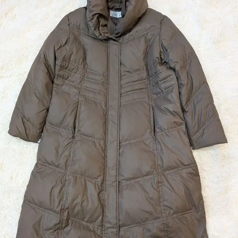 브라운 롱 기장 다운 자켓, 사이드 포켓 포함.