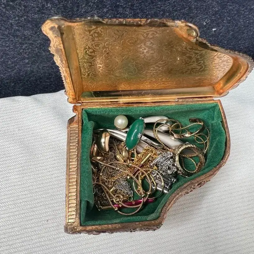 장식적인 금속제 피아노형 쥬얼리 박스, 그린 컬러 벨벳 내부.