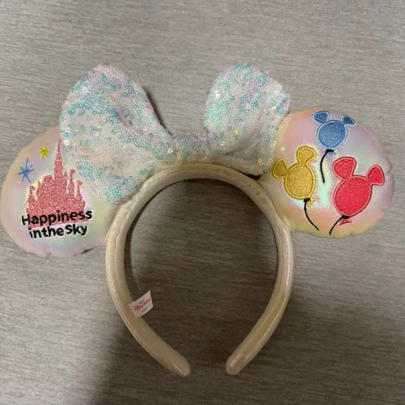 미키마우스의 벌룬 디자인이 특징인 머리띠. - 디자인: 미키마우스 벌룬 디자인 - 텍스트: Happiness in the Sky - 색상: 멀티 컬러 (화이트, 핑크, 블루) - 장식: 라메 믹스 리본 - 스타일: 머리띠 방문해 주셔서 감사합니다.