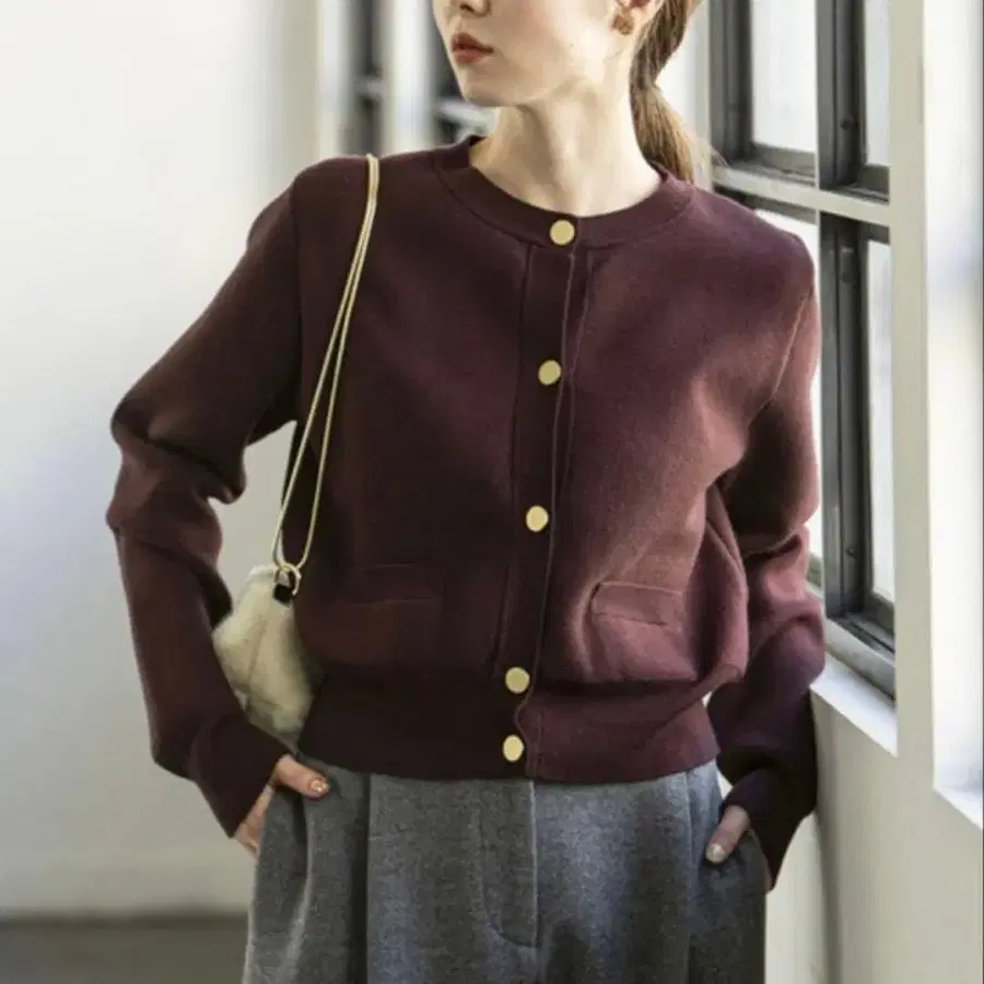 보르도 컬러에 골드 버튼이 겨울 느낌을 주며 매우 귀여운 가디건입니다.