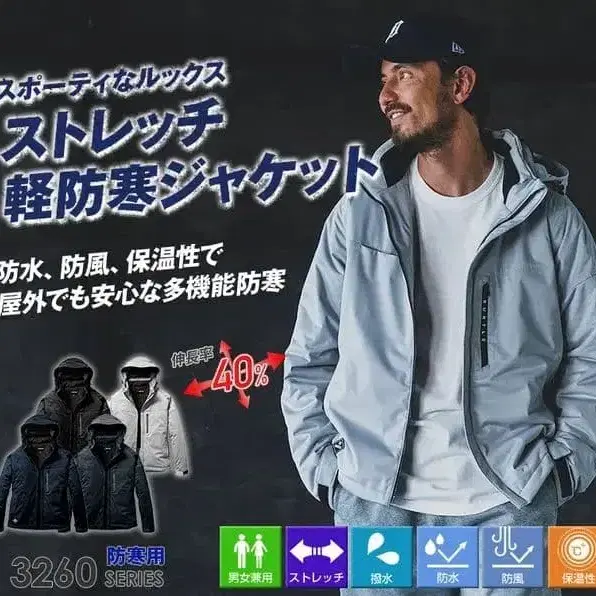 고밀도 스트레치 니트 (신축률 40% 이상), 내수압 10,000mm, 방풍성 (라미네이티드 코팅), 강한 발수 가공