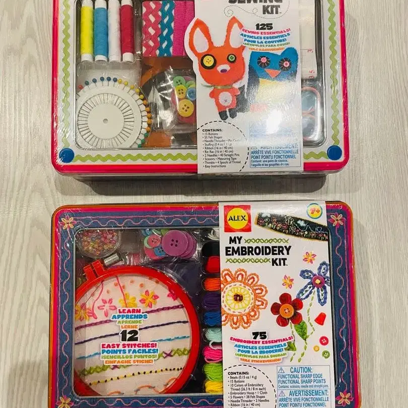세트 내용 - 실, 버튼, 바늘, 핀, 바늘꽂이, 가위, 실 꿰기, 손가락 보호대, 리본, 메이저, 펠트, 솜, 설명서