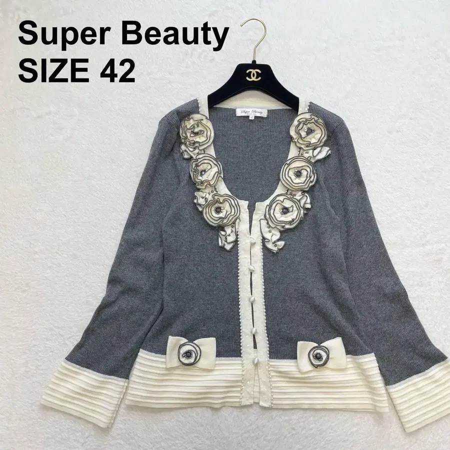 플라워 모티브 장식 니트 가디건 비쥬 펄 입체 꽃 리본 배색 바이컬러 울 혼방 긴팔 엘레강트 고급 페미닌 성숙/러블리 빅 사이즈