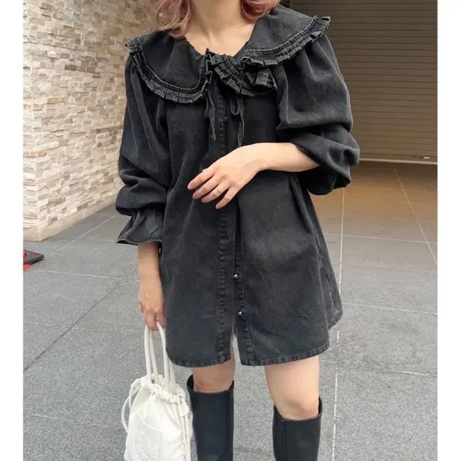 어른스럽게 코디할 수 있는 워시 블랙 데님 셔츠.