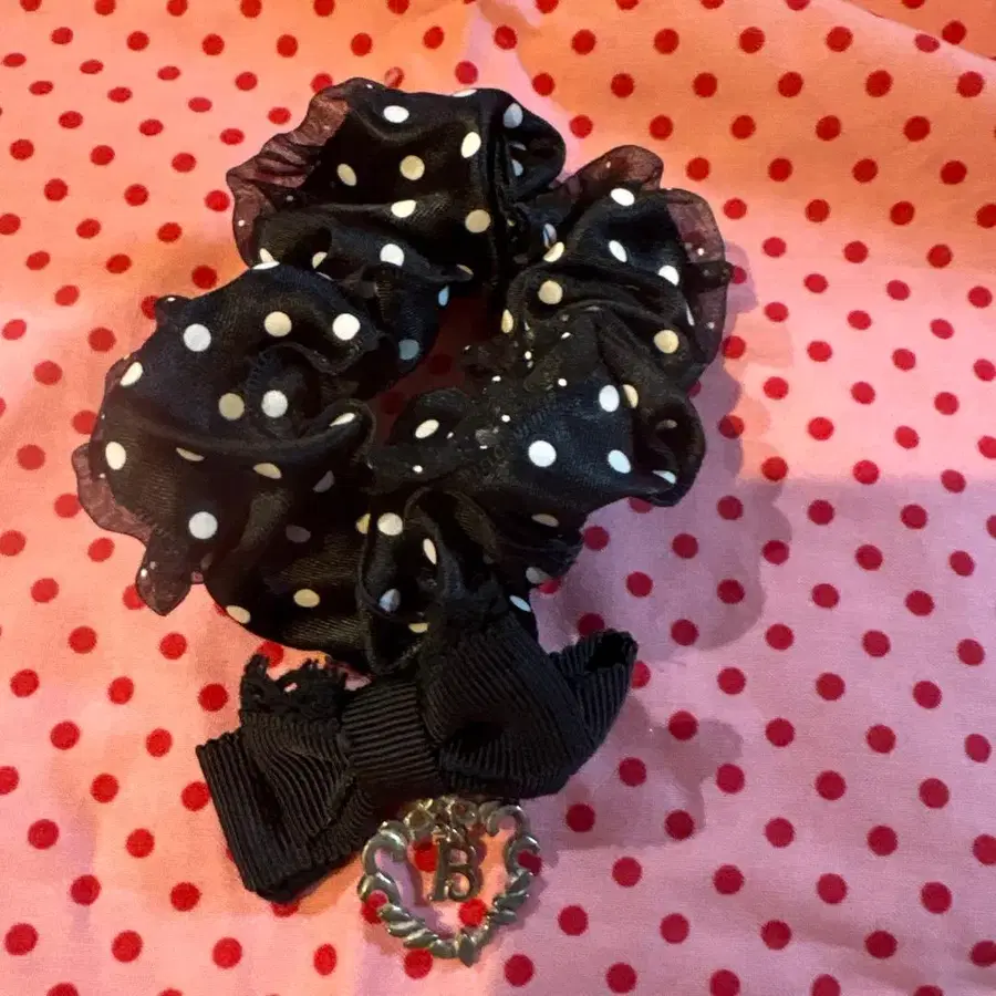 ○ 블랙과 화이트 물방울 무늬 프릴 스크런치, 리본과 하트 모양 참 포함.