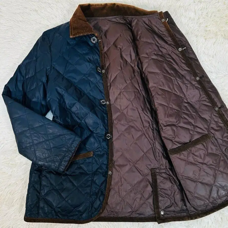 특징: 1벌로 2가지 스타일 연출이 가능한 리버서블 사양. 다운 90%로 가볍고 따뜻함. 옷깃과 테두리에 코듀로이 소재를 사용한 고급스러운 디자인. 로고 버튼이 악센트. 영국 전통의 퀼팅 스타일.