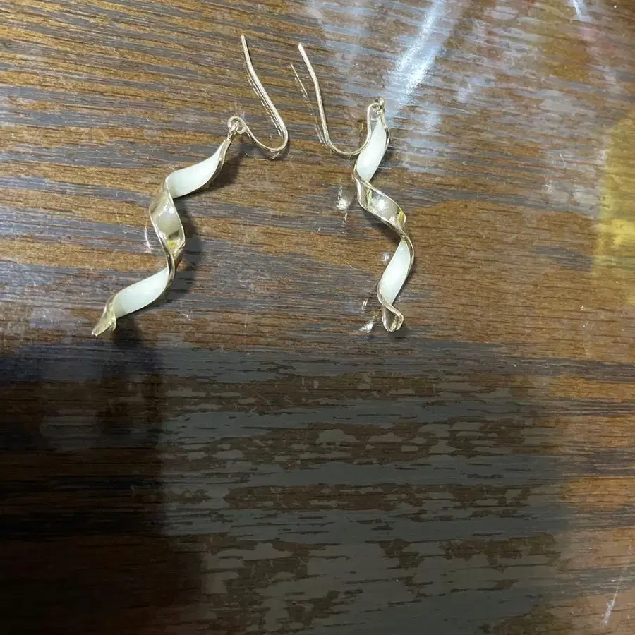 트위스트 디자인의 화이트와 골드 귀걸이. - 디자인: 트위스트 디자인 귀걸이 - 소재: 금속제 (아마도 합금) - 색상: 화이트와 골드의 콤비네이션 - 스타일: 캐주얼부터 포멀까지 대응 가능 방문해 주셔서 감사합니다.