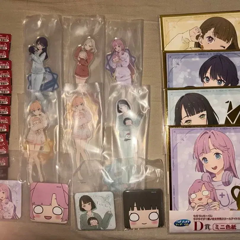 세가 럭키 쿠지 C상 아크릴 스탠드, D상 색지, E상 캔뱃지입니다. 세트 가격. 낱개 판매 불가. 더블 찬스상 응모 시리얼 코드(미사용)가 적힌 영수증도 함께 드립니다. 종류 확인을 위해 개봉했지만 미사용품입니다. 히노시타 카호 무라노 사야카 오토소네 코즈에 유기리 츠즈리 오사와 루리노 후지시마 메구미 안요지 히메메 아토마치 코스즈 햐쿠쇼 긴코 세라스 야나기타 리리엔펠트 카츠라기 이즈미