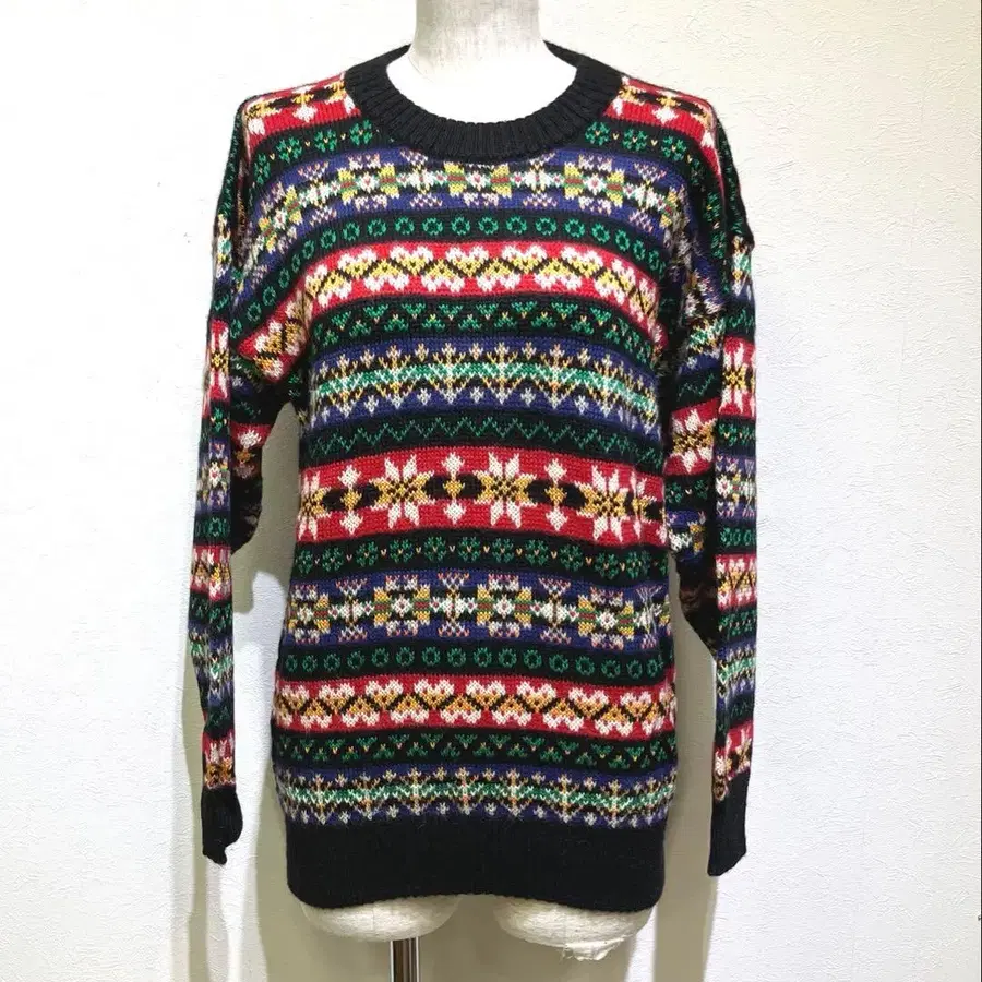 다색 페어아일 패턴 니트 스웨터, 긴팔, 크루넥 디자인. 연대는 불명이나 빈티지 상품으로 추정됩니다. - 색상: 다색 ( 빨간색, 파랑, 그린, 화이트, 블랙 ) - 디자인: 페어아일 패턴 - 소매 길이: 긴팔 - 소재: 니트 - 넥라인: 크루넥 방문해 주셔서 감사합니다. 사이즈 ( 평평하게 놓음 ) 어깨 너비: 51cm 가슴 너비: 49cm 소매 길이: 47cm 기장: 64cm