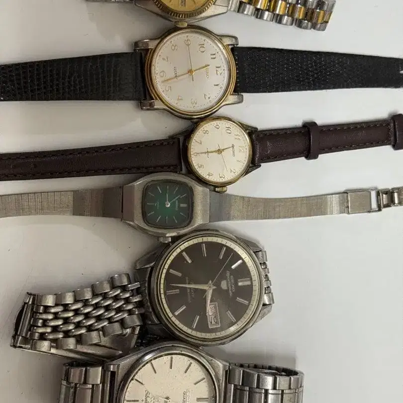 다양한 디자인의 SEIKO 시계 세트, 쿼츠와 자동 태엽 기능 포함. - 브랜드: SEIKO - 모델: Quartz - 모델: SilverWave - 모델: Seiko5 sportsmatic - 모델: Seiko 21 jewels - 모델: Seiko5 automatic 자동 태엽 시계는 모두 정상 작동합니다. 나머지는 멈춰 있으며, 배터리 방전 또는 고장 가능성이 있습니다.