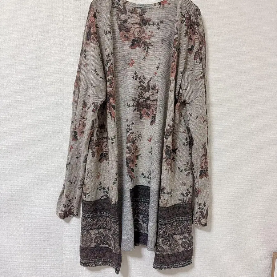 자동 번역되었어요. 원문보기꽃무늬 디자인의 그레이 계열 가디건, 사이즈 S.