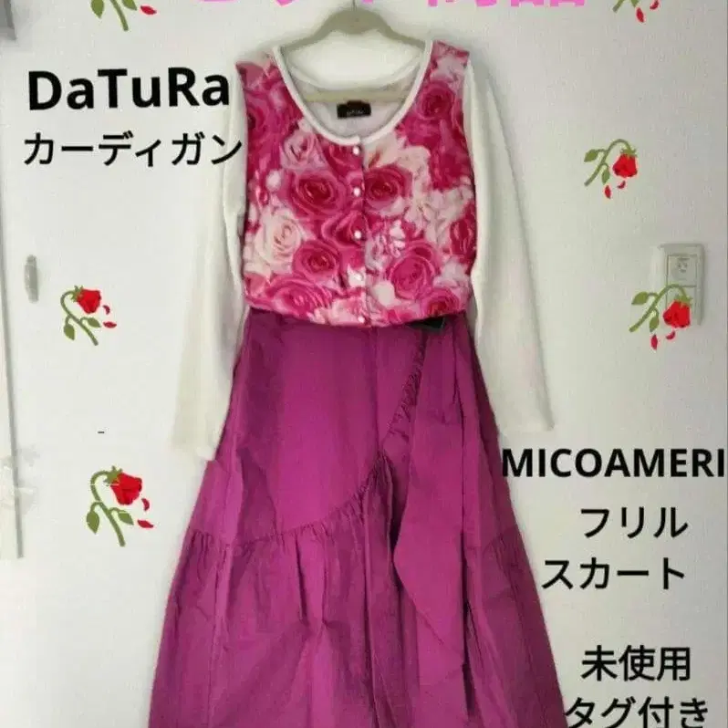 *화이트 색상의 긴팔로, 핑크색의 선명한 장미 박스 패턴의 본체 (프론트 오픈 단추식)를 조합한 디자인으로 펄 버튼이 달린 숏 가디건입니다.