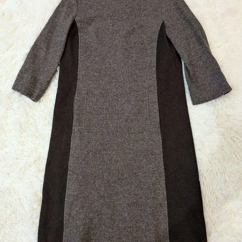 그레이와 다크 브라운 배색의 심플한 A라인 실루엣 7부 소매 원피스. 사이드 포켓이 있으며, 뒷면에 지퍼가 있습니다.