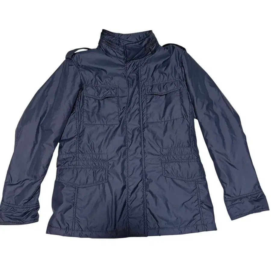 네이비 색상의 밀리터리 자켓으로, 4개의 포켓과 스탠드 카라가 특징입니다.