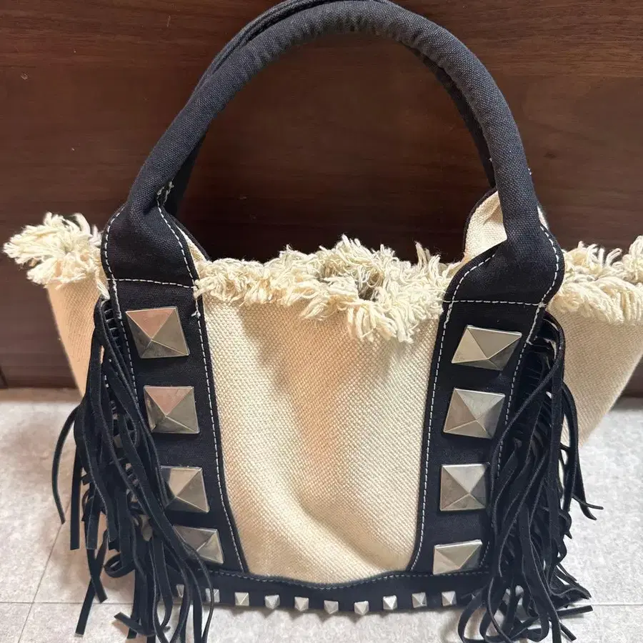 스터드와 프린지가 특징인 DIAVEL 토트백. - 브랜드: DIAVEL - 색상: 베이지/블랙 - 디자인: 스터드 장식/프린지 장식 - 소재: 캔버스 - 스타일: 토트백 방문해 주셔서 감사합니다.