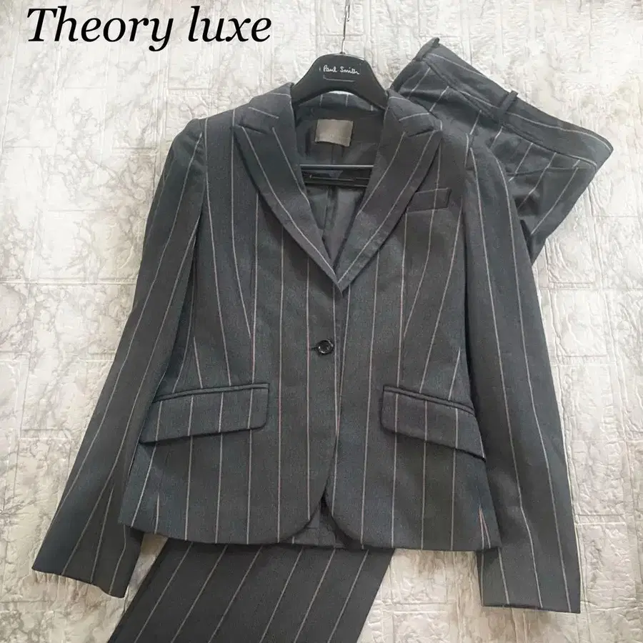 띠어리 럭스다운 고급스럽고 세련된 스트라이프 패턴의 셋업 수트입니다.