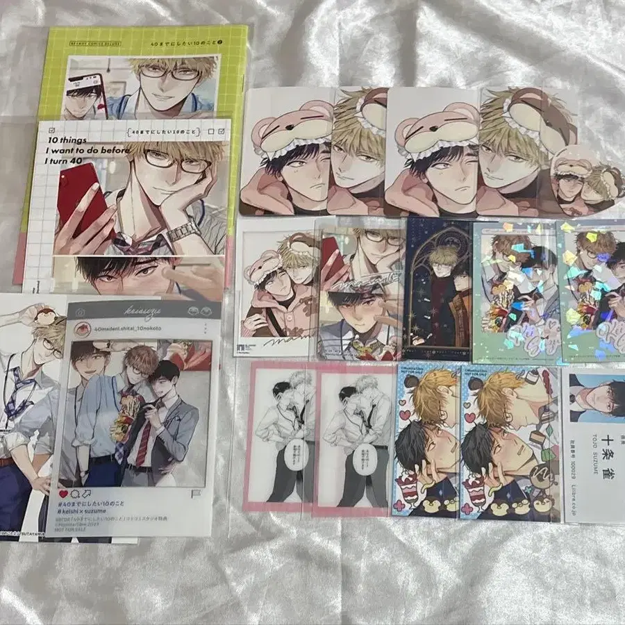 40세까지 하고 싶은 10가지 일 마미타 애니메이트 한정판 소책자 1회독 코미코미 스튜디오 특전 4p 리플렛 1회독 코미코미 스튜디오 특전 클리어 카드 TSUTAYA 특전 엽서 bl 어워드 카드 각 2개 특전 스티커 1개, 금박 카드 1개 코미코미 오브 더 이어 특전 카드 비보이 페어 2025 특전 1개, 클리어 카드 2개 비보이 페어 2024 특전 2개 나츠!bl 페어 특전 카드 2개 실사 기념 페어 사원증 1개 즉시 구매 ◎ 반품 x